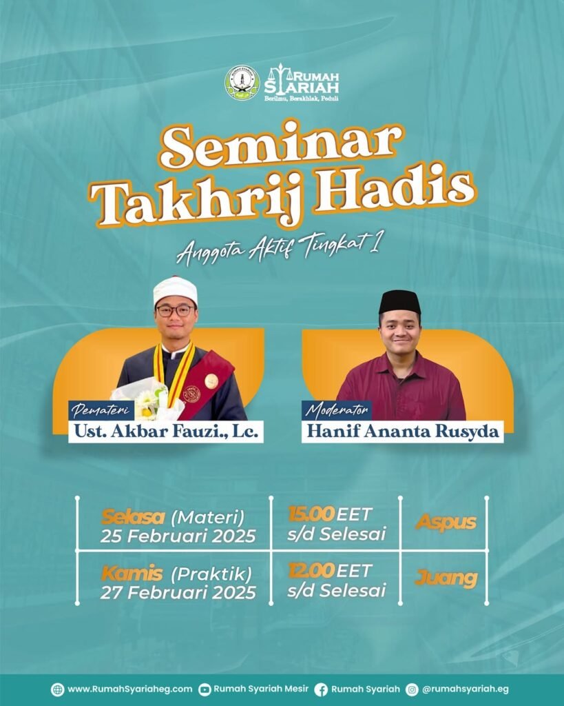 Berita Maraknya Komersialisasi Hadist, Rumah Syariah Bekali Anggotanya dengan Seminar Takhrij Hadist Rumahsyariaheg.com, Kairo- Ditengah riuhnya perekonomian masyarakat dewasa ini, Tak